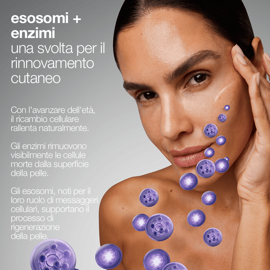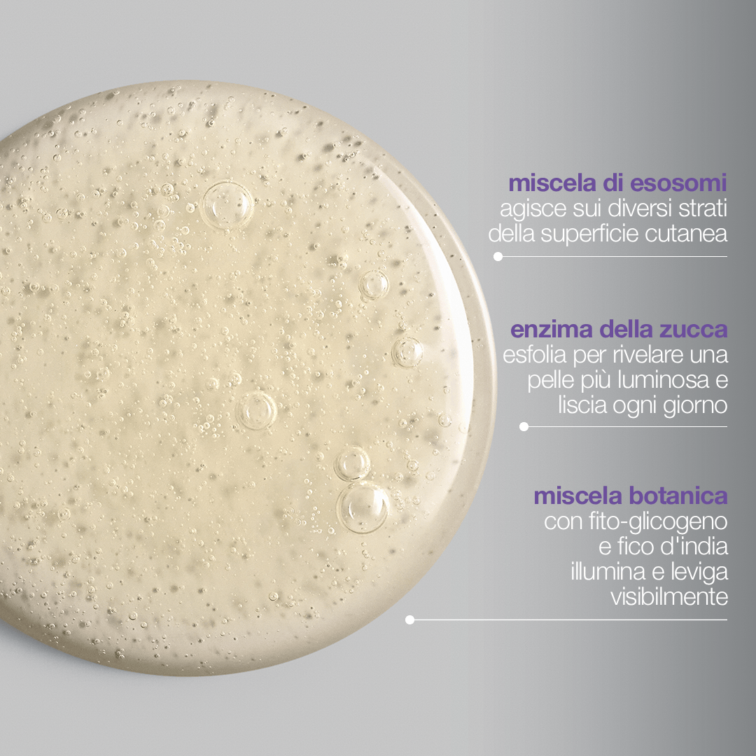 L'innovativo prodotto preparatorio con esosomi: questo prodotto quotidiano, setoso e leggero, combina enzimi ed esosomi in una formula rivoluzionaria che supporta la rigenerazione naturale della pelle dall'interno ogni giorno.